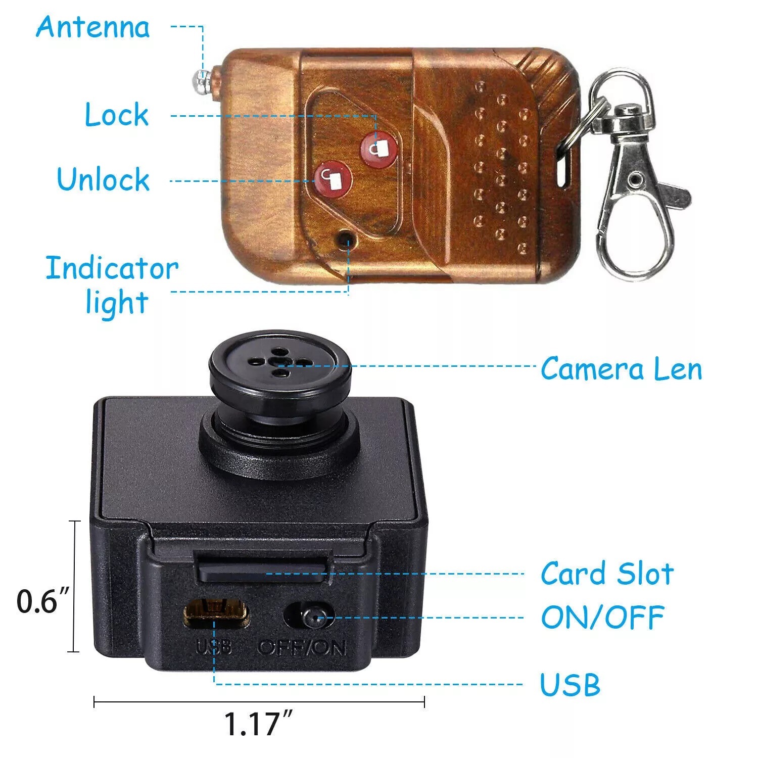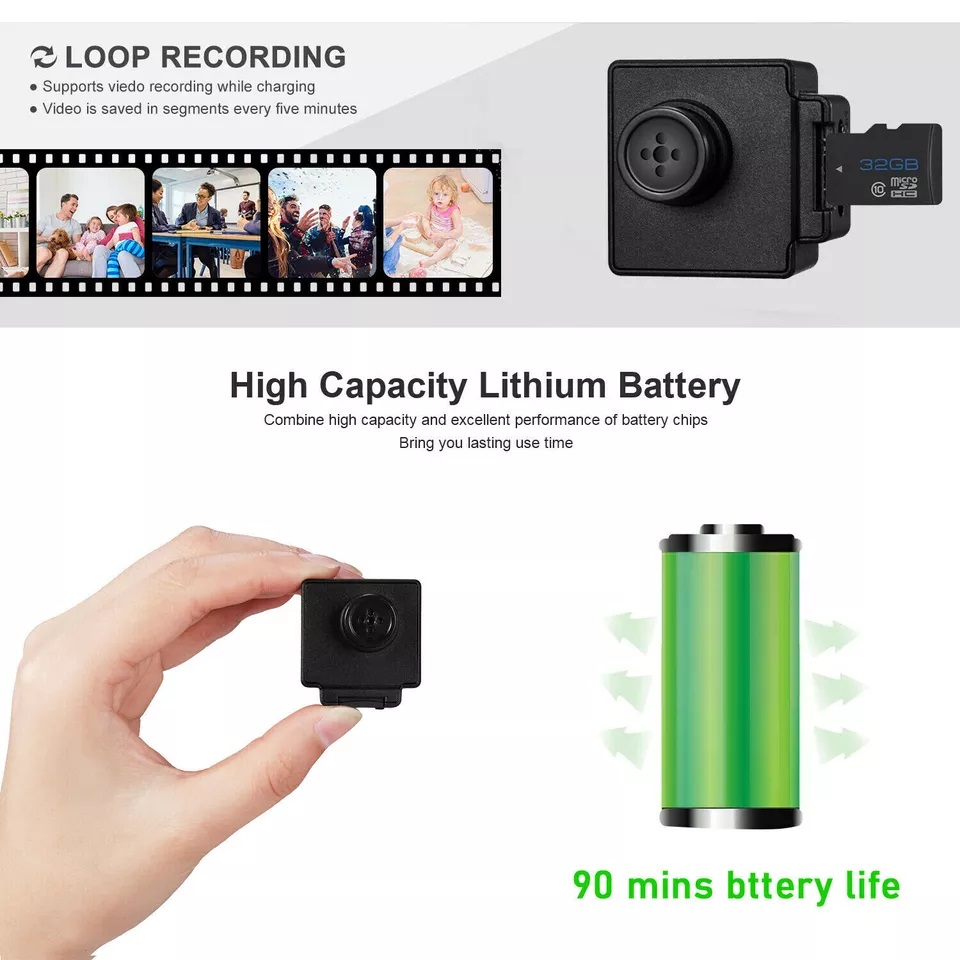 กล้องแอบถ่าย กล้องสายลับแบบกระดุม ควบคุมระยะไกลไร้สาย พร้อมแบตเตอรี่บันทึกเวลาได้ 90 นาทีในตัว ใช้งานได้เต็มรูปแบบโดยไม่ต้องต่อสายใดๆ และสามารถสวมใส่กับเสื้อเชิ้ตหรือเสื้อแจ็คเก็ตได้ ติดเข้ากับเสื้อผ้าได้ง่ายและควบคุมด้วยรีโมทคอนโทรลเพื่อเริ่มและหยุดการบันทึก มีความละเอียด Full HD 1920p x 1080p ที่ 30 เฟรมต่อวินาที โดยจะบันทึกทุกภาพและเสียงด้วยความละเอียดสูงเป็นเวลา 90 นาทีต่อการชาร์จหนึ่งครั้ง การชาร์จแบตเตอรี่จนเต็มใช้เวลา 2-3 ชั่วโมงด้วยหัวชาร์จโทรศัพท์ USB มาตรฐาน ในการถ่ายโอนการบันทึกวิดีโอ ให้ถอดการ์ด SD และเสียบเข้ากับเครื่องอ่านการ์ด USB ที่ให้มาและเชื่อมต่อกับพีซีหรือ MacBook ไฟล์วิดีโอสามารถดูได้บน VLC Player หรือ Windows Media Players และเข้ากันได้กับระบบปฏิบัติการทั้งหมด